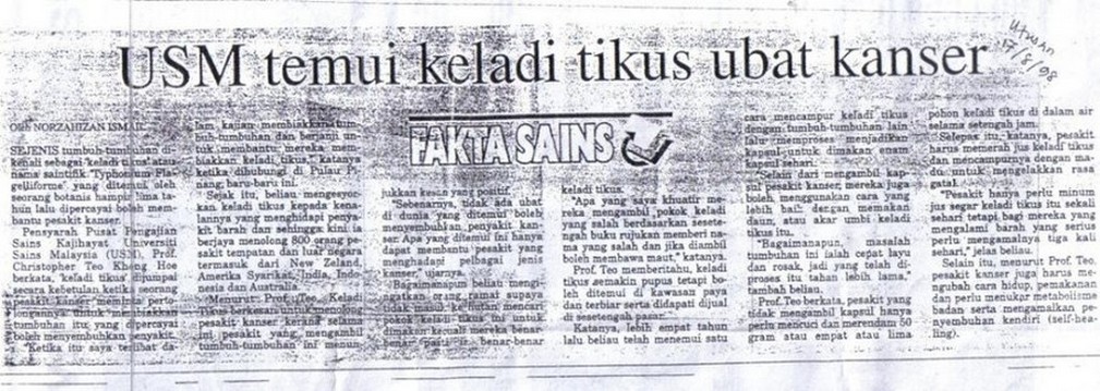 Keladi tikus ubat kanser, Utusan Malaysia, arkib negara, 17/8/1998. Kredit Universiti Sains Malaysia, Pulau Pinang